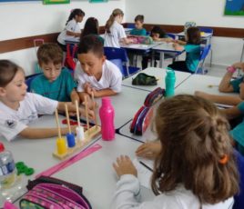 Os terceiros anos do Ensino Fundamental I exercitaram as operações matemáticas como adição, subtração, divisão e multiplicação no ábaco com o jogo “nunca 6”. A cada partida , o aluno precisa manter seu resultado abaixo de seis. Este ajuda a reforçar e construir noções de ordens e classes, assim como trabalho em equipe e autonomia. Experiências dinâmicas como esta, facilitam muito o raciocínio lógico matemático.